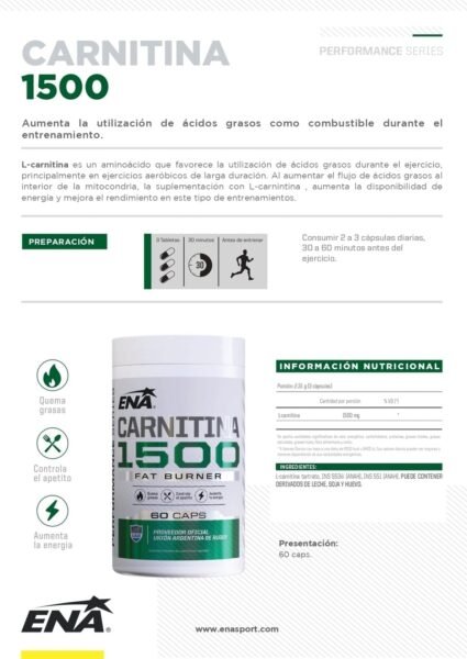 Es un producto superior esencial para quién está buscando reducir grasas y ganar más energía. Es de la más alta pureza, para asegurar los mejores resultados. CARNITINA 1500 MG es un producto que se consume previo a los entrenamientos, ya que al quemar grasas aporta la energía que necesitas para rendir al máximo.